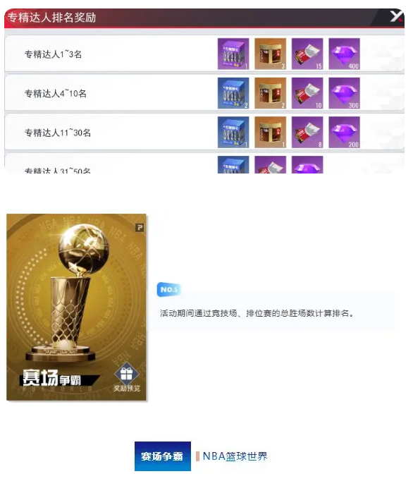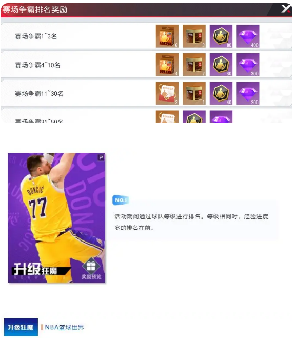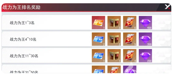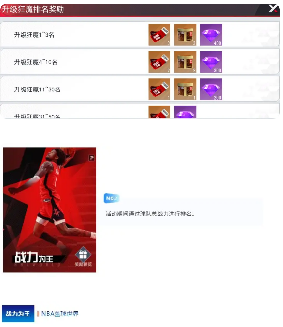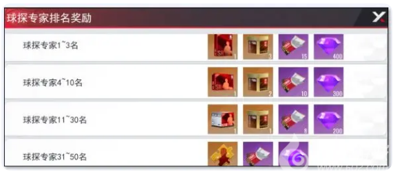 第1~3名奖励SR自选包,第4~10名奖励SR球员随机包,第11~30名奖励S/SR球星包。